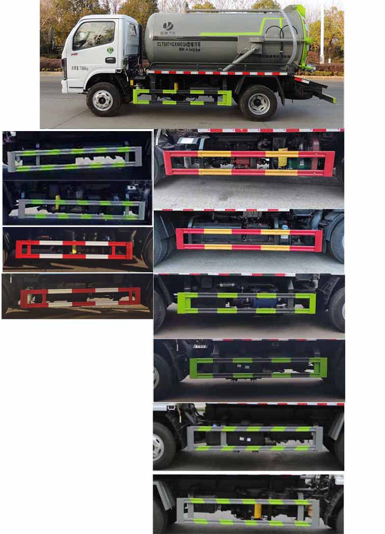隨底盤選裝燃油箱,電瓶,尿素罐,儲氣筒左右安裝位置.該車用于吸除水坑、下水道里污濁物;主要裝置有罐體及吸污裝置;罐體總容量:4.04立方米,罐體有效容積:3.85立方米,罐體外形尺寸(總長×直徑)(mm):3800×1300;ABS型號/廠家:ABS/ASR-12V-4S/4M/襄陽東風隆誠機械有限責任公司;側、后防護材料均為:Q235碳鋼,連接方式均為:螺栓連接,后部防護截面尺寸(mm):120×50,后部防護離地高度(mm):410.卸料方式為后卸式;隨底盤選裝駕駛室,選裝燃油箱,電瓶,尿素罐,儲氣筒左右安裝位置.