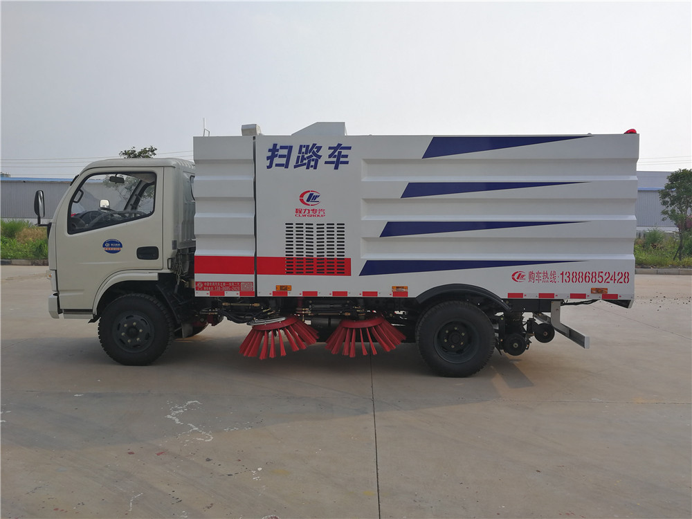 該掃路車采用東風多利卡二類底盤改裝,加裝副發動機、風機、清水箱、垃圾箱、左右立掃、掃盤降塵系統,液壓系統、專用裝置電控系統和副車架等改裝而成。