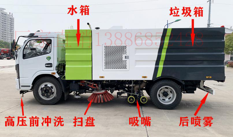 該洗掃車采用東風多利卡國六二類底盤改裝,加裝副發動機、風機、清水箱、垃圾箱、左右立掃、掃盤降塵系統、左右高壓側噴高、吸盤內置高壓主噴桿、氣動系統、液壓系統、專用裝置電控系統和副車架等改裝而成。